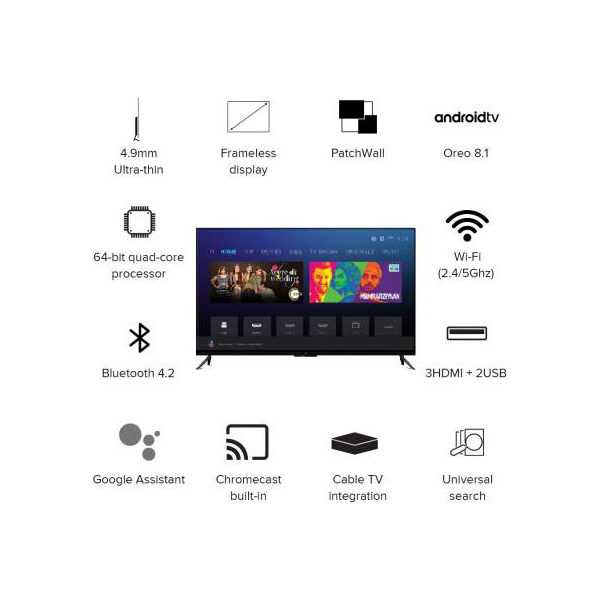 Operate this TV easily as it comes with the PatchWall user interface (Android Oreo). It gives you the access to Google Play Store, so you can enjoy a host of amazing apps. Thanks to 14+ content partners, you can now enjoy 700,000+ hours of content using this TV.