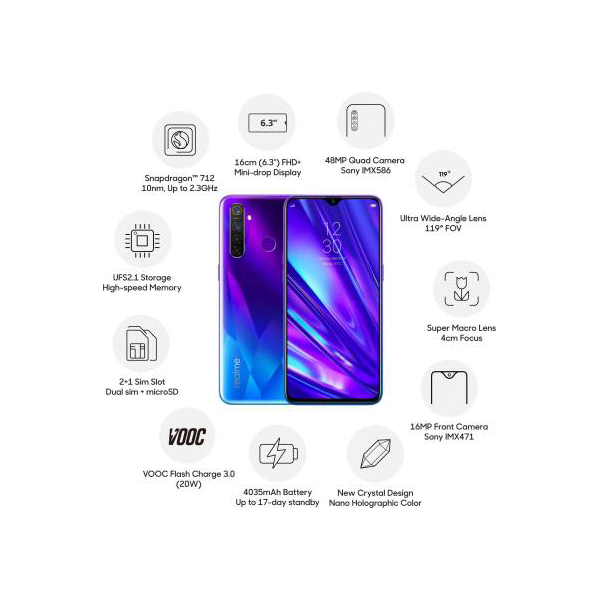 Right from texting your buddies to clicking incredible pictures - the Realme 5 Pro lets you do more of what you love. Powered by a 10 nm octa-core Qualcomm Snapdragon 712 AIE processor, this phone lets you multitask seamlessly. Thanks to the 48 MP AI Quad Camera, you can capture beautiful scenic views on film. Watch everything on its 16 cm (6.3) FHD+ Mini-drop display come to life.